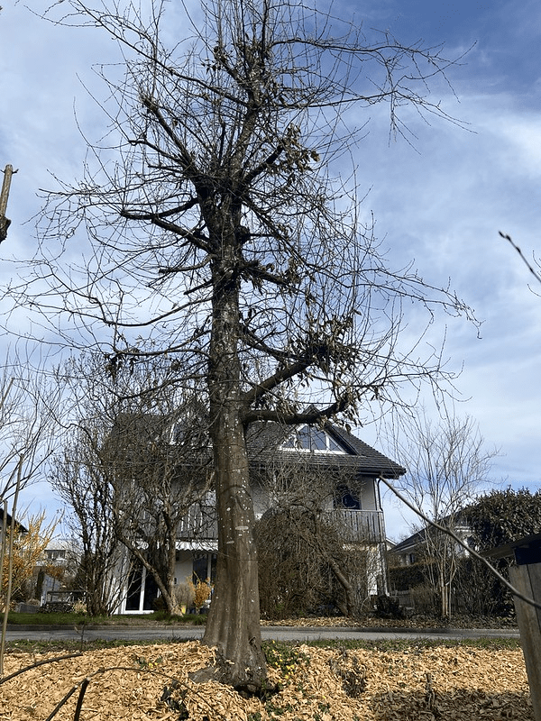 This tree seems to have reach its limits, even in Spring: no leaves and no fresh growth, but it is still possible. The gardener was here last week and prepared the ground. There is no rush, and the tree has plenty of time to develop its leaves.