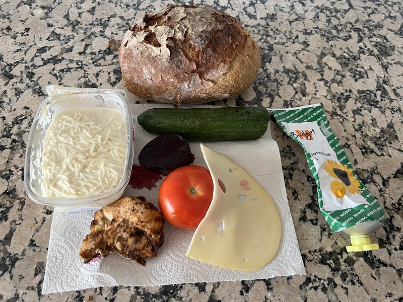 Sunday Evening and time to think about something to eat. I had to examine the contents of what was still in the fridge and found a pot of celery salad which I quite like. I do not make it myself, the local store does a good mixture. I also had some chicken left from yesterday evening. Actually I put it on one side to eat this evening. A tomato, cucumber, beetroot was also available as well as some cheese, so what could be better: a mixed cold dish for the evening meal with some salard cream and fresh bread – the first things coming to my mind for an evening meal. Just five minutes preparation for my dish.